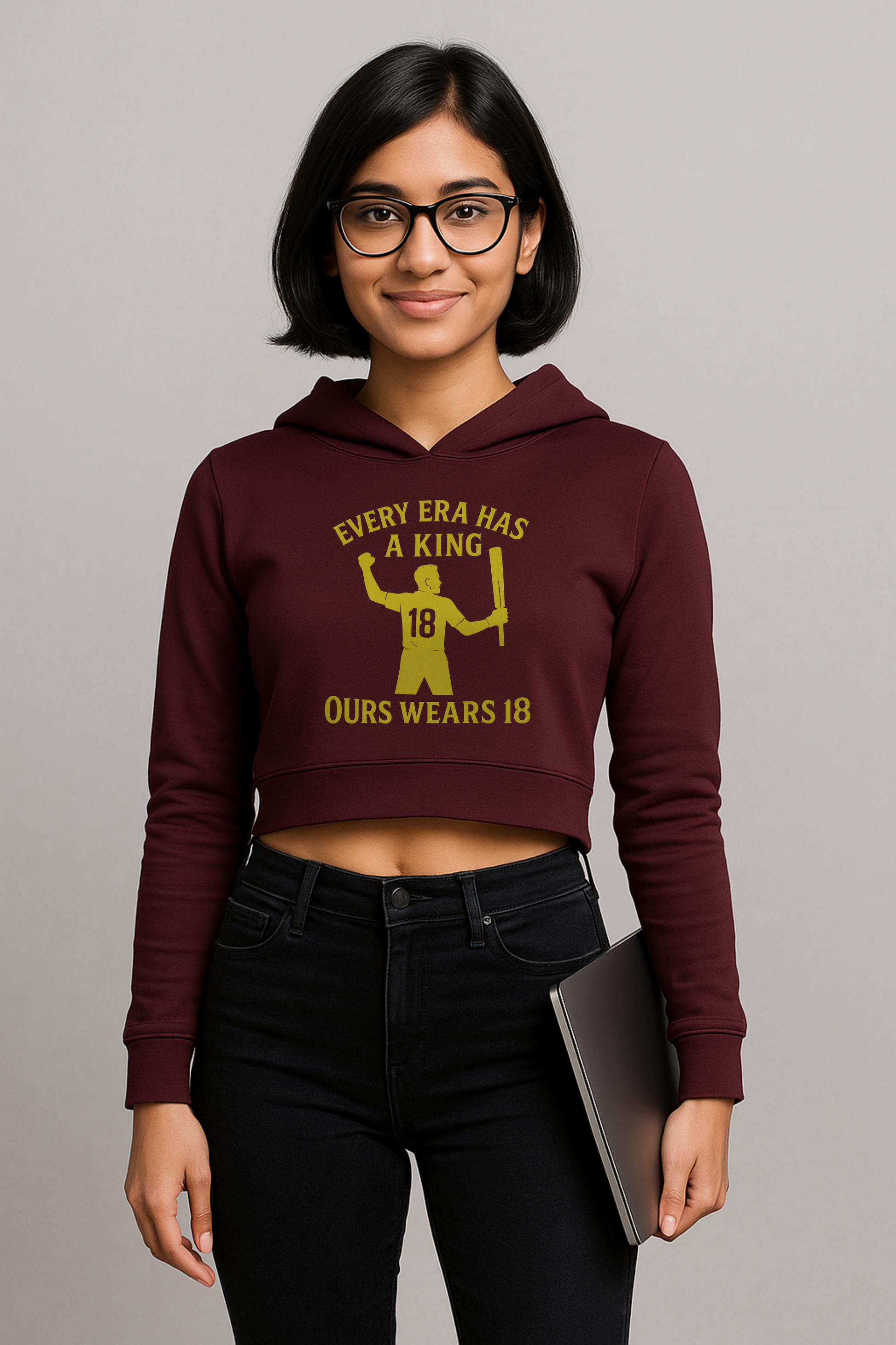 Stylish cropped hoodie celebrating King Kohli. Designed for women who love cricket and bold fashion.